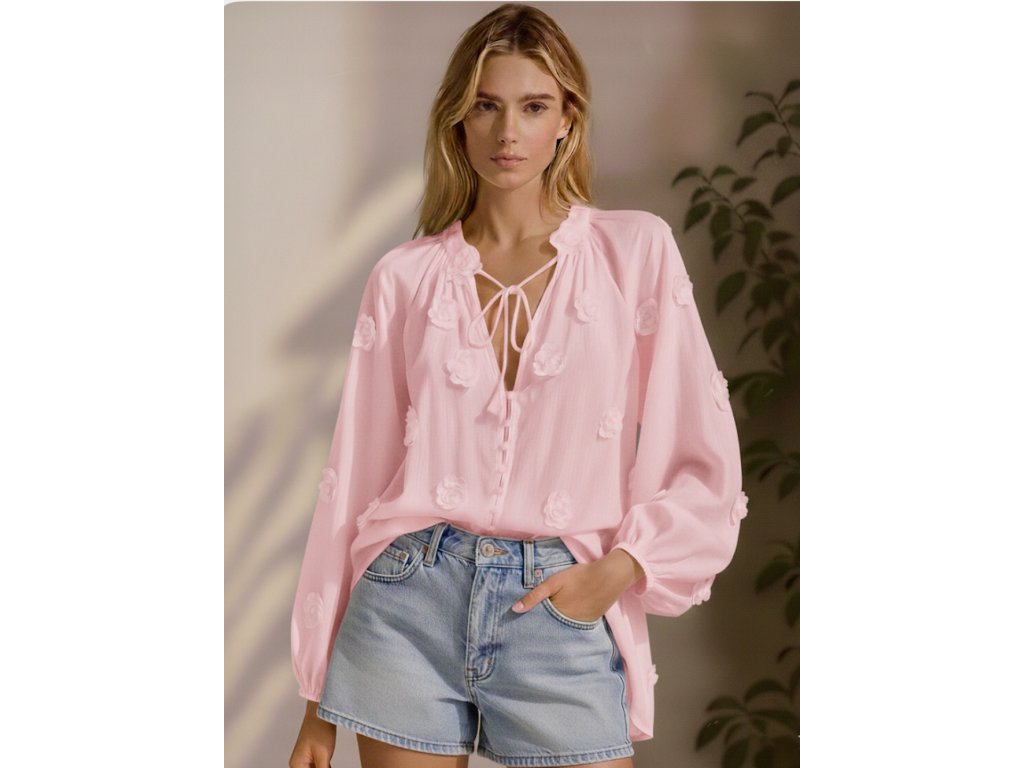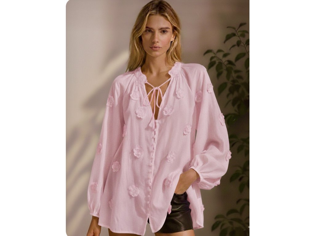 Halenka má volnější střih, výstřih do V se zapínáním na drobné knoflíčky a ozdobné šňůrky u krku, které lze nosit volně nebo zavázané. Rukávy jsou zakončené jemnou gumičkou pro pohodlné nošení. Díky lehkému materiálu je ideální jak na běžné denní nošení, tak i na elegantnější příležitosti.