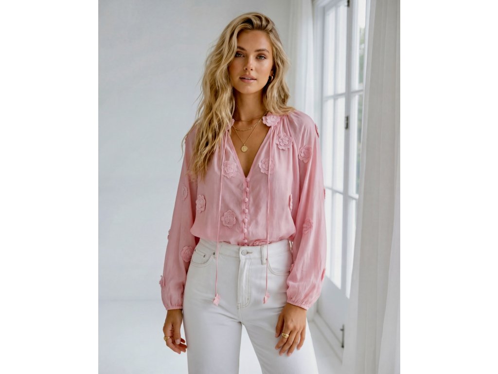 Romantická a vzdušná halenka z jemného, poloprůhledného materiálu, která dodá outfitu lehkost a ženský šarm. Elegantní květinové aplikace tón v tónu vytvářejí jemný 3D efekt a působí velmi sofistikovaně.