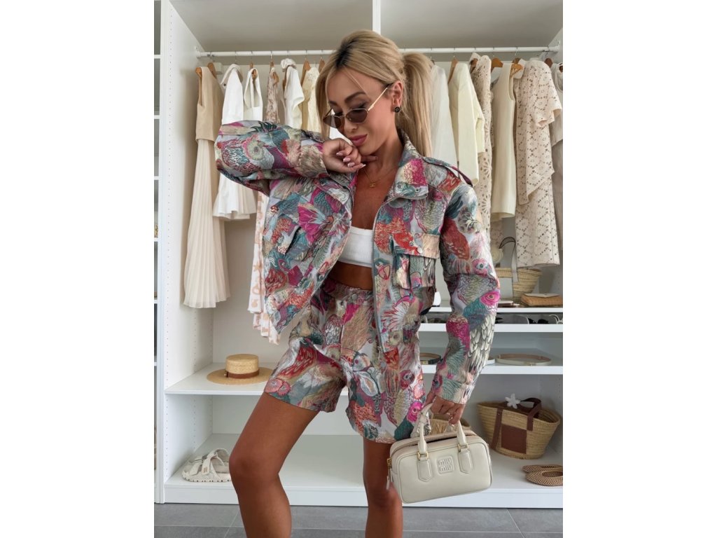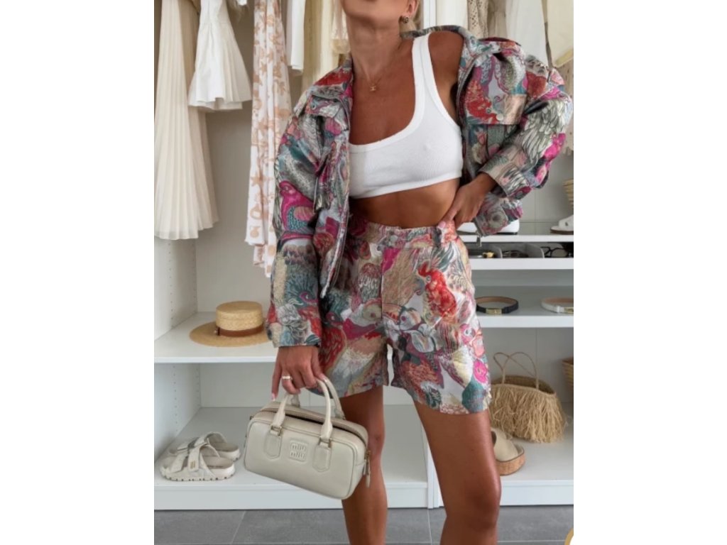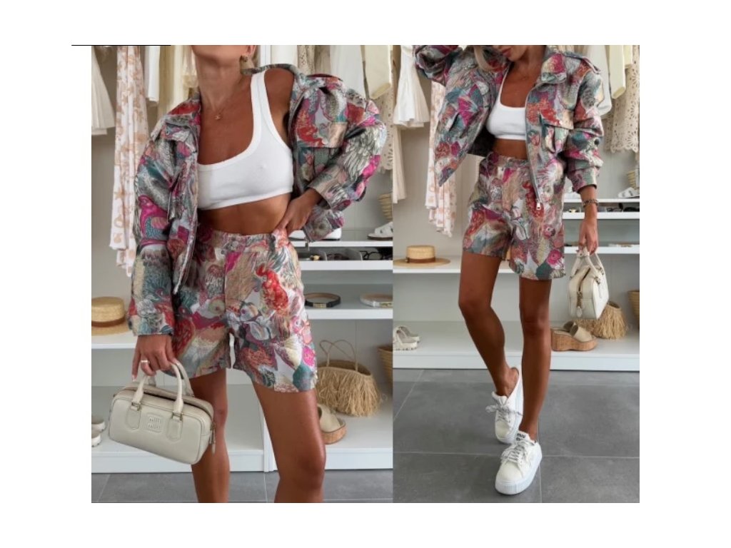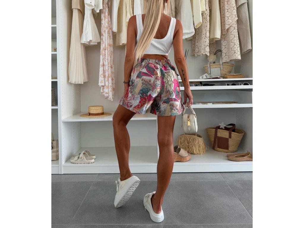 Nádherné, velmi kvalitní a luxusně působící širší šortky z pevnějšího, jemně lesklého materiálu, který zaujme na první pohled. Originální vícebarevný vzor s uměleckými motivy dodává modelu výrazný a prémiový charakter. Šortky mají klasické zapínání na zip a knoflík. Postranní dvě kapsy. Guma v pase zaručí pohodlné nošení a maximálně se přizpůsobí postavě. Díky kvalitnímu zpracování a precizním detailům je ideální volbou pro ženy, které chtějí výrazný, ale stále velmi vkusný kousek.