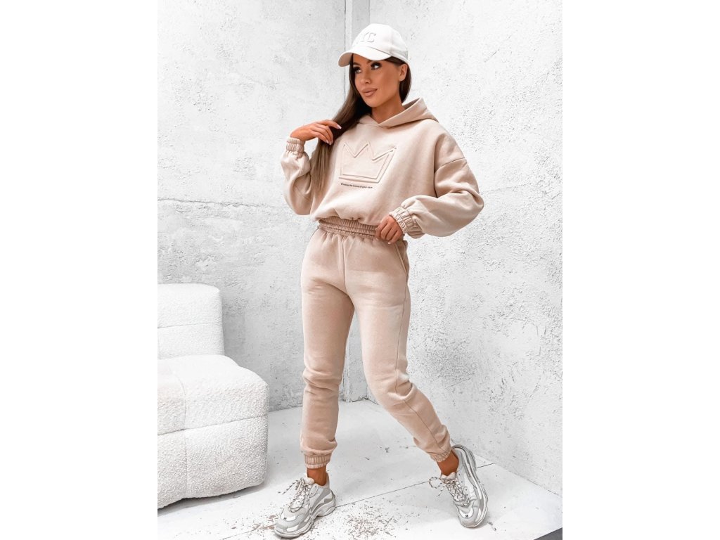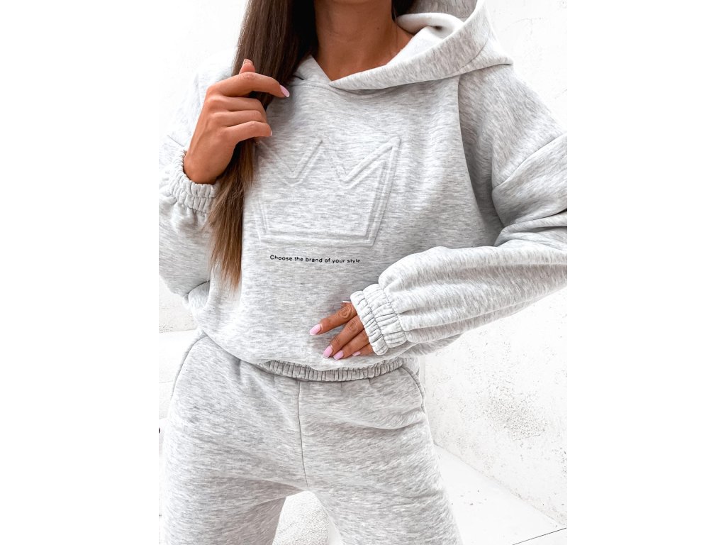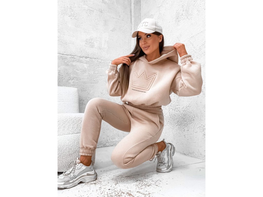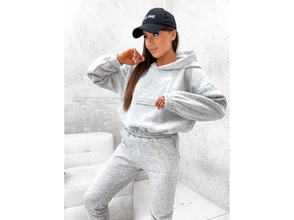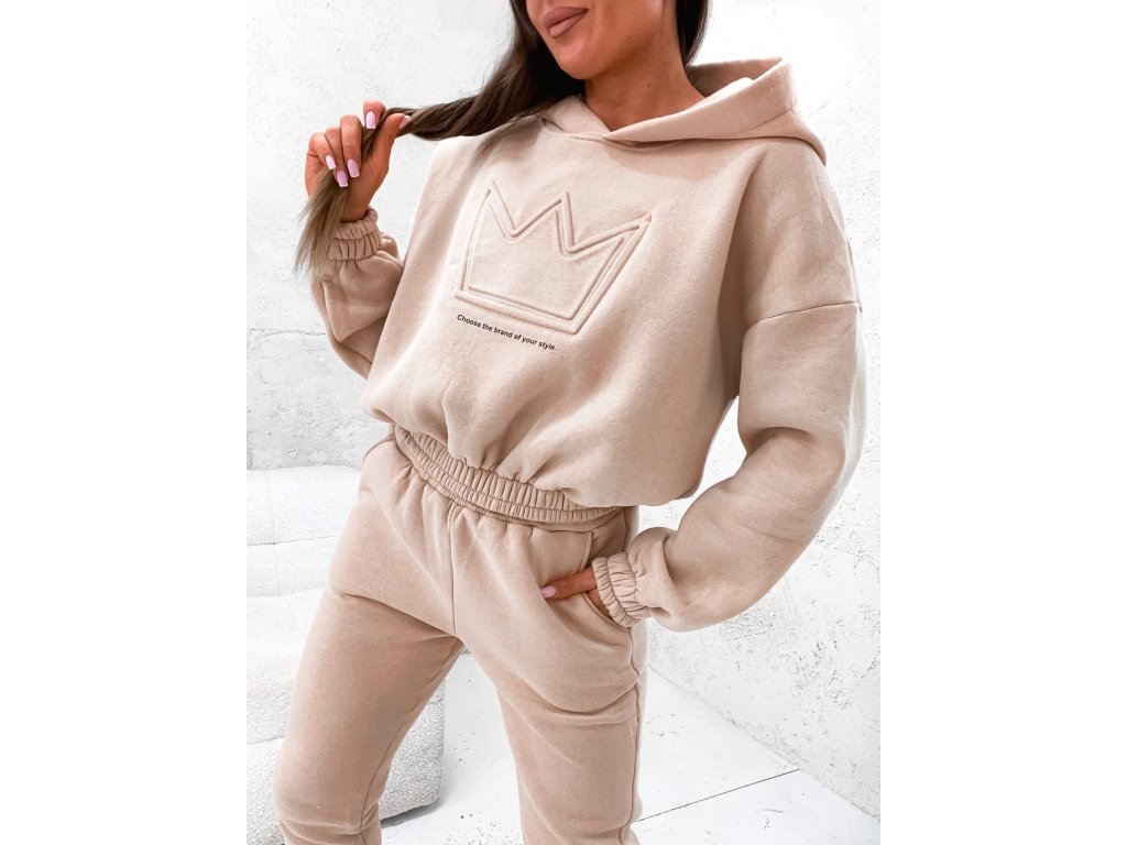 Mikina má kapuci, stahovací guma v pase jí dodává moderní look. Díky tomu mikina nejen skvěle vypadá, ale také dobře ladí na siluetě. Tepláky mají stahovací gumu v pase a na spodku nohavic, což jim dodává sportovní charakter, ale také to, že nohavice dobře sedí a při chůzi se nepodvírají.
