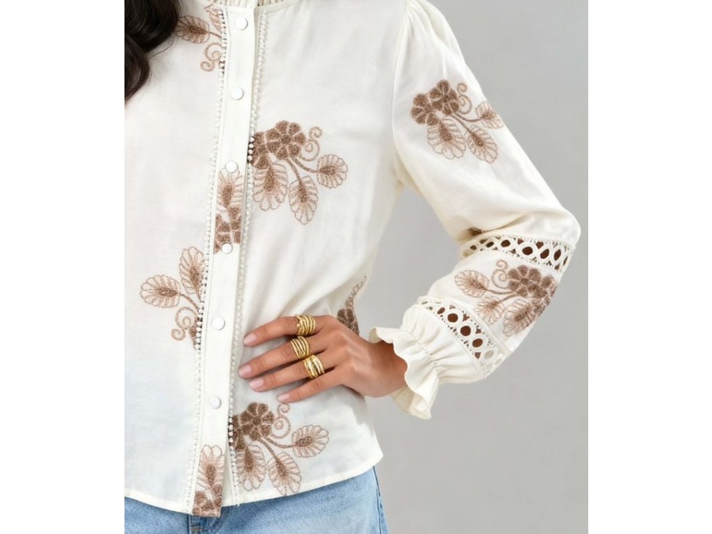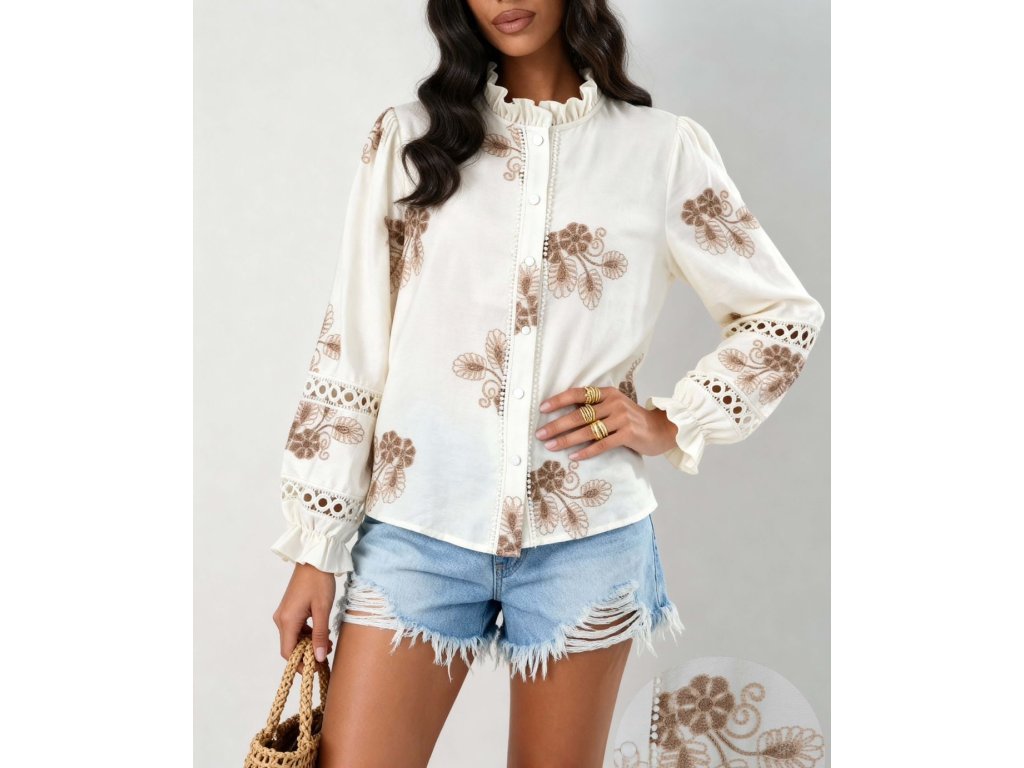 Elegantní dámská halenka z lehkého a vzdušného materiálu je vhodná na jaro a léto. Zdobí ji jemná květinová výšivka v přírodních tónech, která působí velmi decentně a dodává halence romantický vzhled. Dekorativní krajkové vsadky na rukávech podtrhují ženský styl. Střih je pohodlný a lichotivý. Skvěle se hodí k džínům, kraťasům i sukni. Ideální do města, dovolenou i běžné nošení.