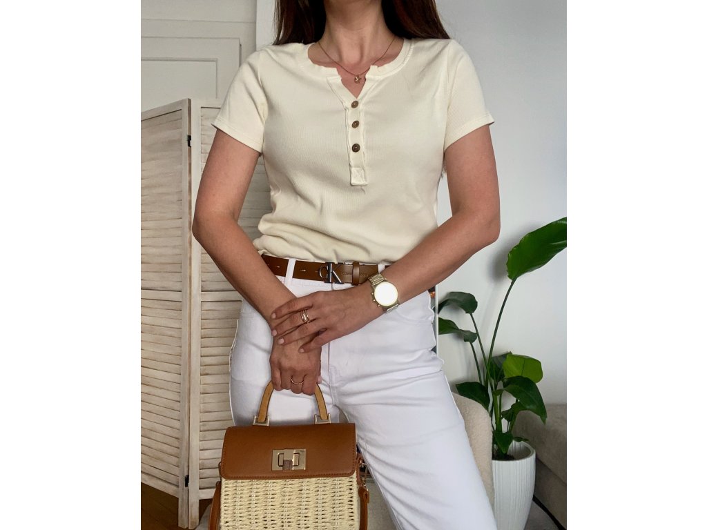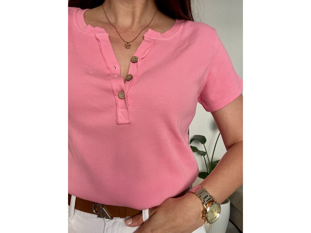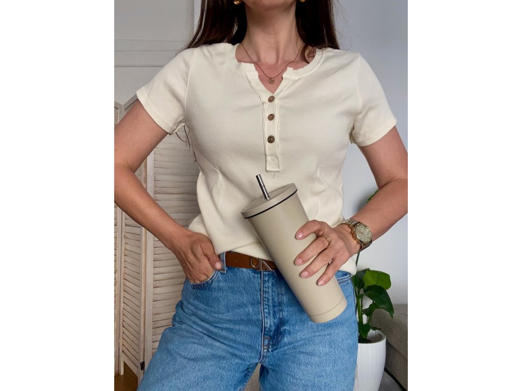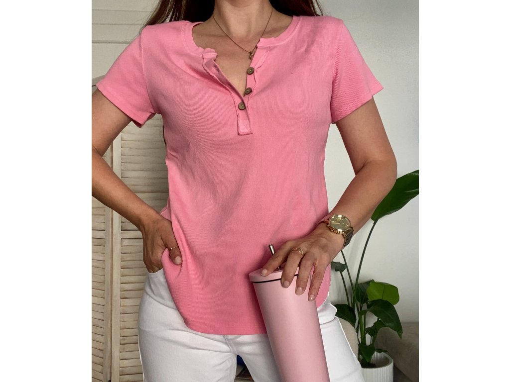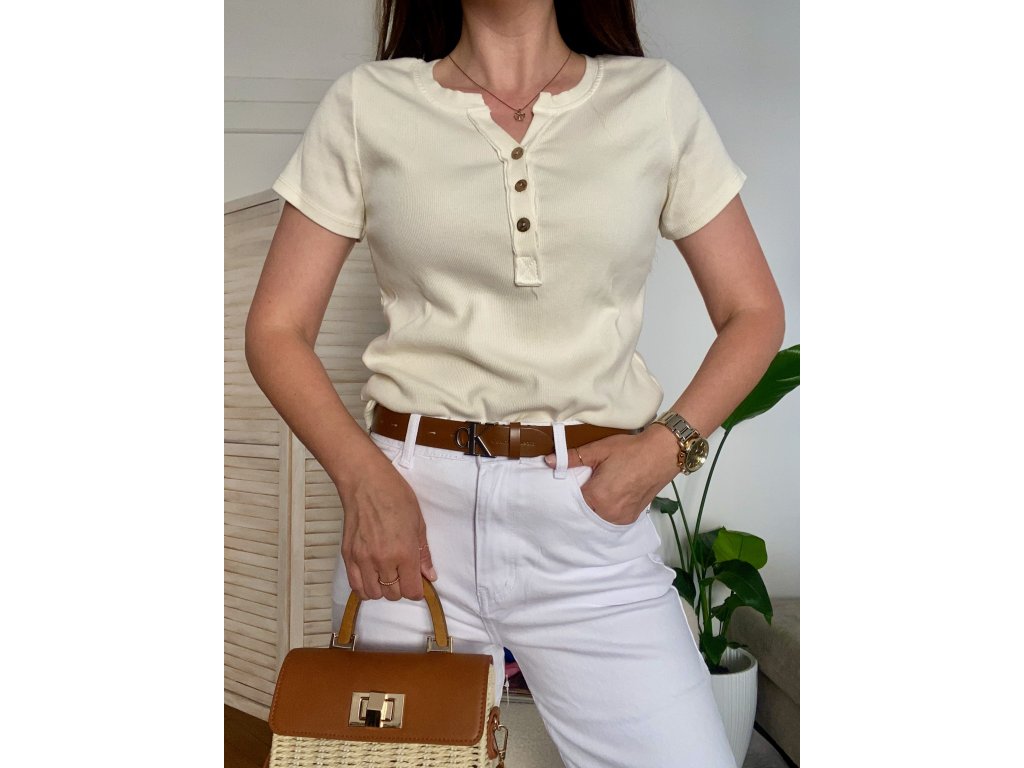 Stylové tričko se zebrovanou strukturou z příjemně elastického materiálu, který se přizpůsobí postavě a zaručí pohodlí po celý den. Dekolt s ozdobnými dřevěnými knoflíky dodává modelu přírodní a originální vzhled. Skvělé pro každodenní nošení i volnočasové outfity.